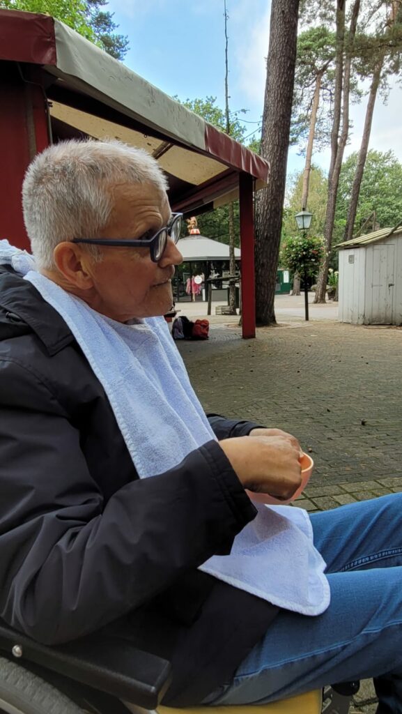 met de rolstoelen. Vooral de paden rondom het olifantenverblijf, waren nu niet bepaald rolstoelvriendelijk. Het was ook maar goed dat de gasten vast zaten in de rolstoel, want anders was er gegarandeerd iemand uitgevlogen. Voor de vrijwilligers was het flink duwen, maar de gasten genoten, en daar ging het om. We hadden zelf lekkere broodjes, beleg en rauwkost meegenomen. Aan de gasten die gemalen eten hadden, was ook gedacht. Daar was een heerlijke rundvleessalade voor meegenomen.